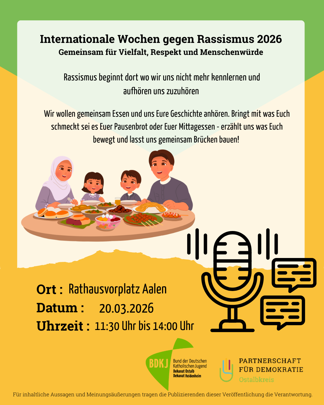 „Rassismus beginnt dort, wo wir aufhören, uns kennenzulernen. Dieser Tisch ist für alle da – bringen Sie etwas mit und teilen Sie mehr als nur Essen.“